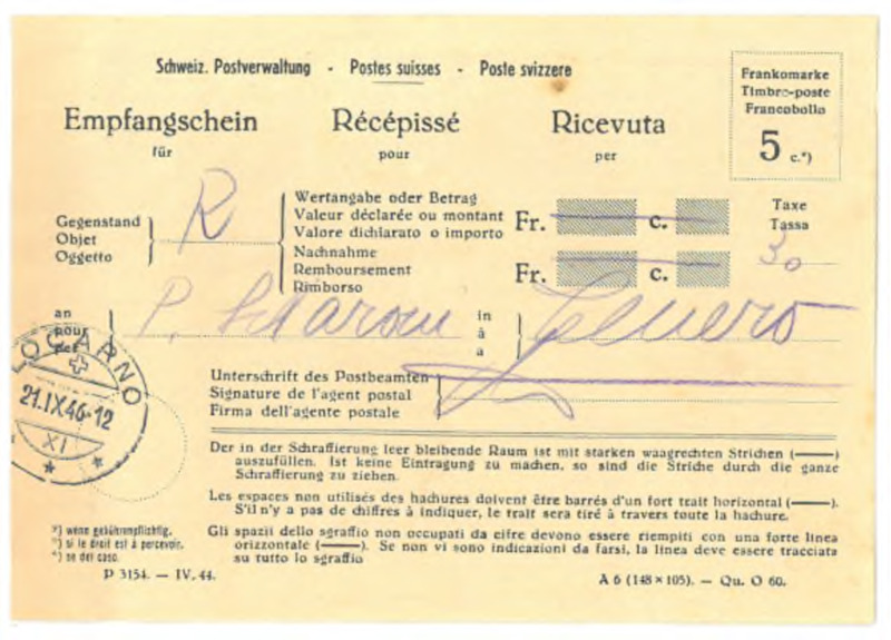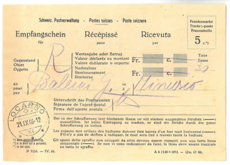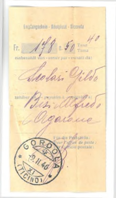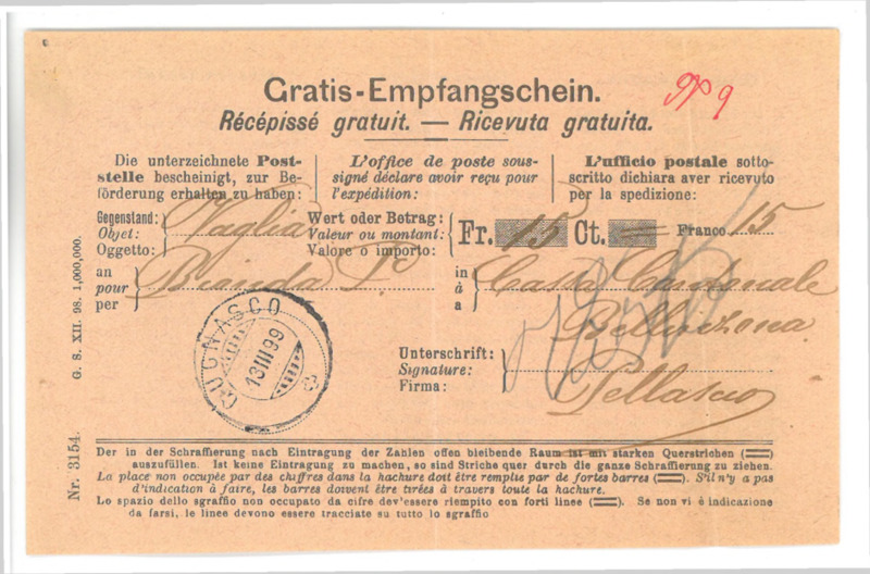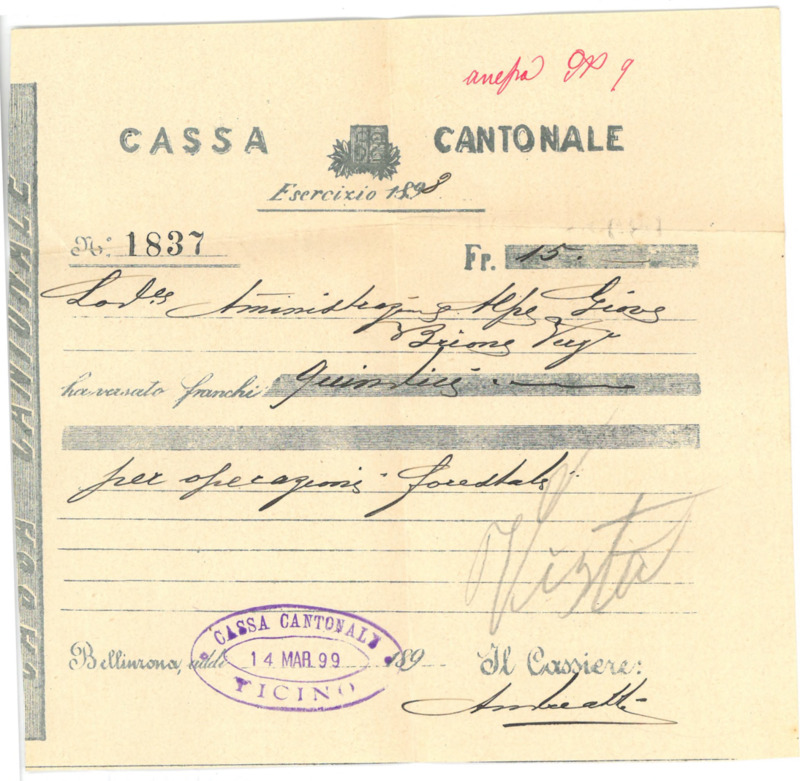 Ricevuta per invio di 15 fr. per Pietro Bionda.