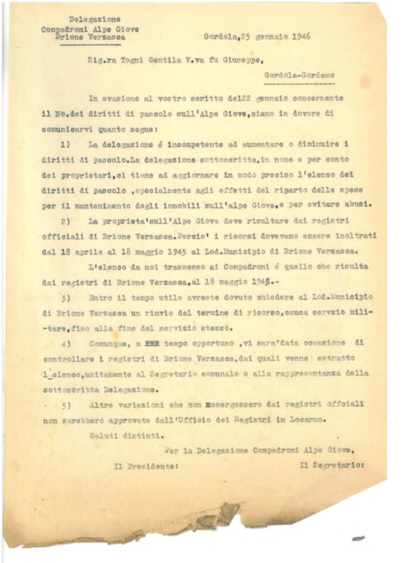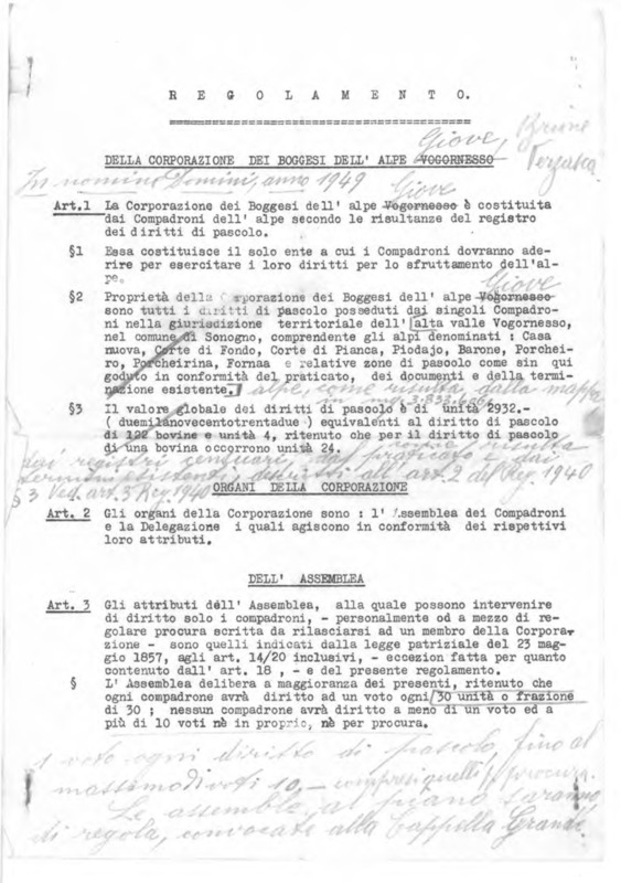Bozza di regolamento del 1949 per l'Alpe di Giove sulla base di quello dell'Alpe Vogornesso del 1948. 14 pagine.