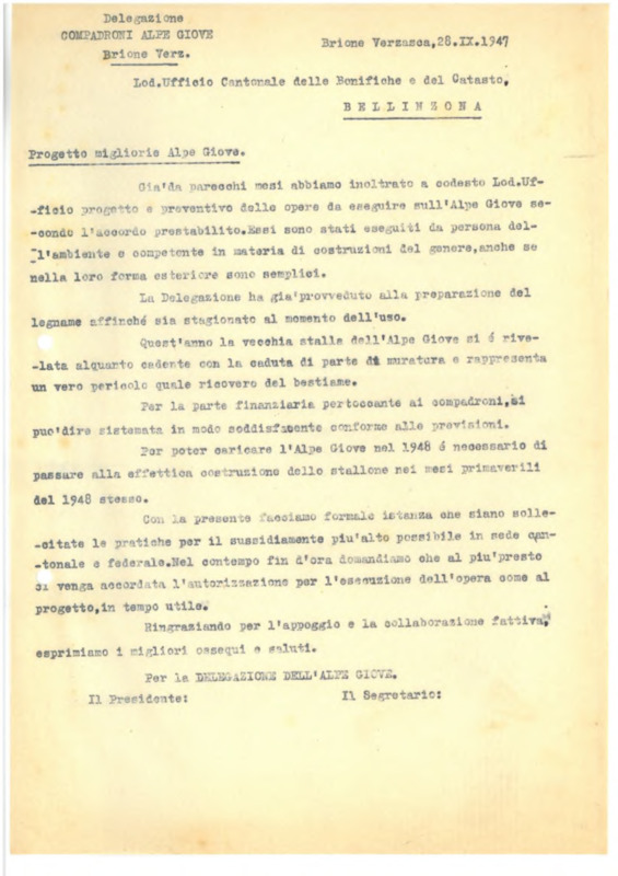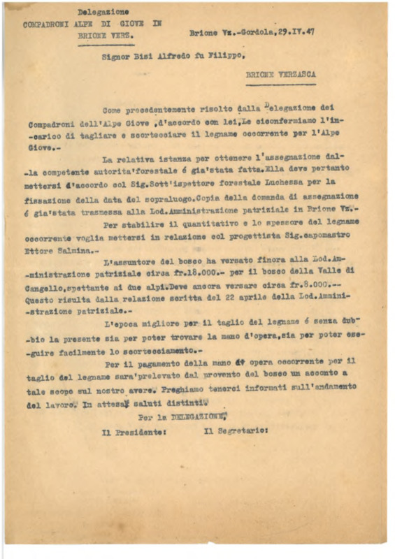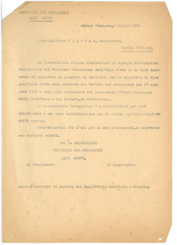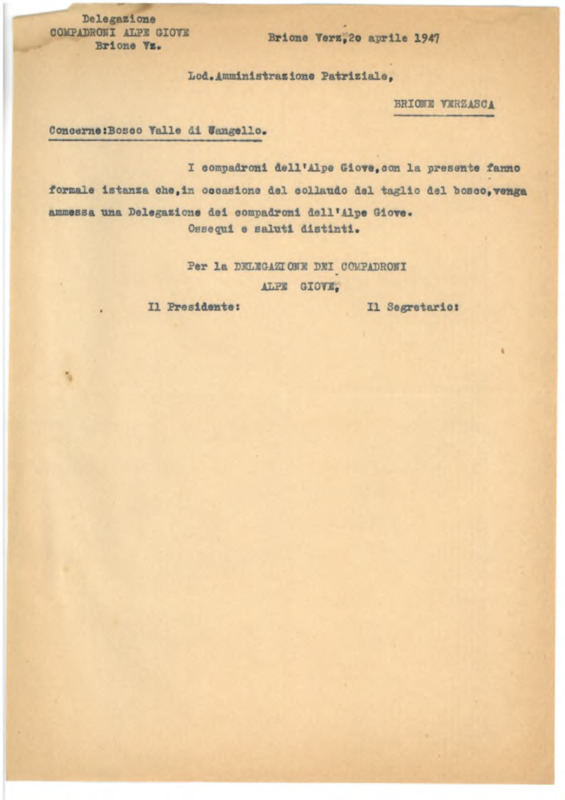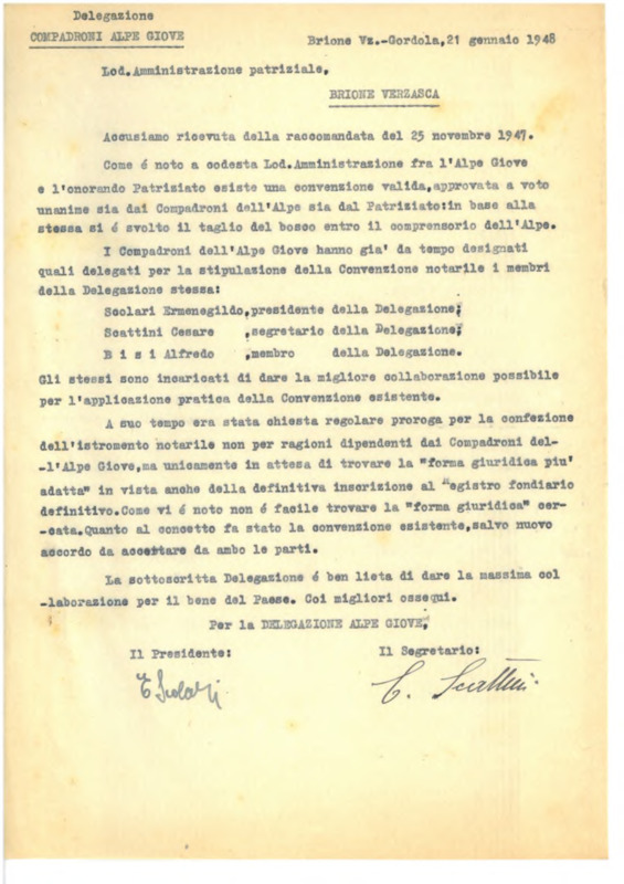 La sottoscritta Delegazione del Consorzio Compadroni dell'Alpe Giove le ha dato incarico