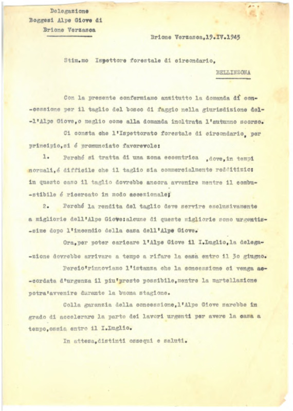 Con la presente confermiamo anzitutto la domanda di concessione per il taglio