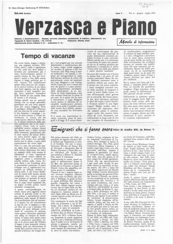 Verzasca e Piano : mensile di informazione, anno V, n. 06, giugno luglio 1971