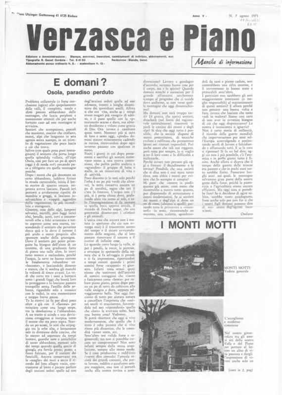 Verzasca e Piano : mensile di informazione, anno V, n. 07, agosto 1971