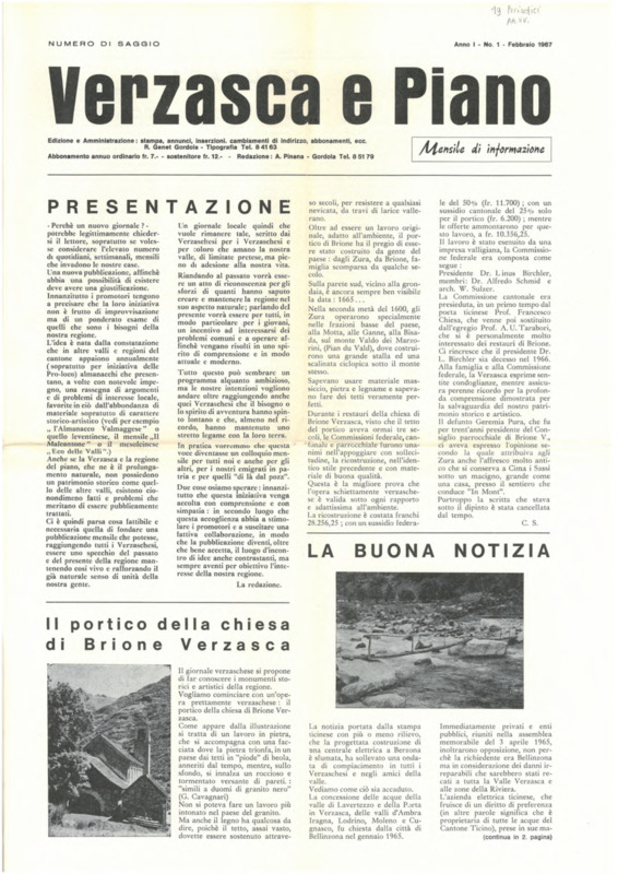 Verzasca e Piano : mensile di informazione, anno I, n. 01, febbraio 1967