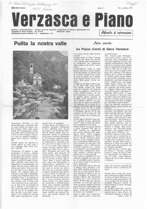 Verzasca e Piano : mensile di informazione, anno V, n. 08, ottobre 1971