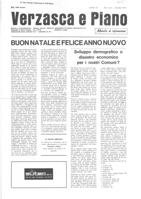 Verzasca e Piano : mensile di informazione, anno VI, n. 08, dicembre 1972