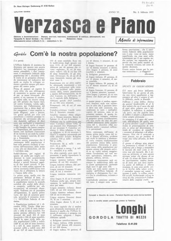 Verzasca e Piano : mensile di informazione, anno VI, n. 02, febbraio 1972