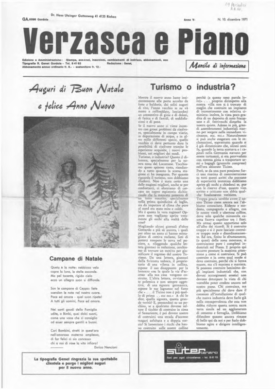 Verzasca e Piano : mensile di informazione, anno V, n. 10, dicembre 1971