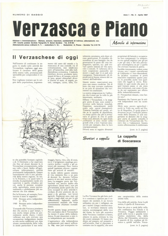Verzasca e Piano : mensile di informazione, anno I, n. 03, marzo 1967