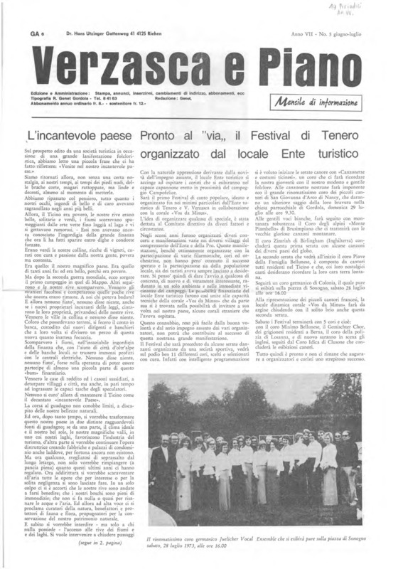 Verzasca e Piano : mensile di informazione, anno VII, n. 05, giugno luglio 1973